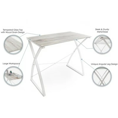 - MODERN STYLE: A tempered glass top with wood grain design and the unique angular leg design gives the Joy desk a chic and sleek look