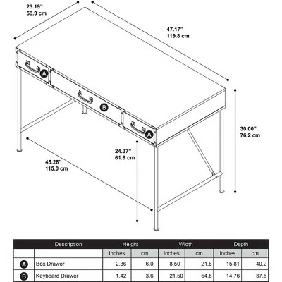 The kathy ireland® Home by Bush Furniture Ironworks 48W Writing Desk in Coastal Cherry offers incredible durability and unique detailing popular in today’s family homes. This collection blends a variety of styles from rustic to modern, while capturing industrial era details with exposed steel legs, Aged Bronze accents and metal pulls. The welded powder coated base provides strength while supporting the durable laminate work surface for day-to-day use. Functional center drawer provides a drop down front which is ideal for keyboard or laptop storage. Complete with two convenient box drawers which are perfect for office supplies. Construction meets ANSI/SOHO furniture standards for strength and durability for affordable home furnishings backed by a 3 Year Manufacturer’s Warranty. And for a total office solution, see the full Collection for coordinating items available.