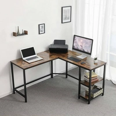 Rejuvenate your work space with the inclusion of this coveted L shape Computer Desk which offers 2 bottom shelves and incorporates grain details. Constructed from the combination of MDF and metal, it is accented with brown and black finish.