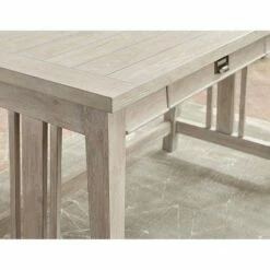 - Wooden tabletop, base and open shelving add natural-looking charm