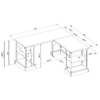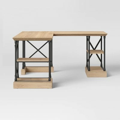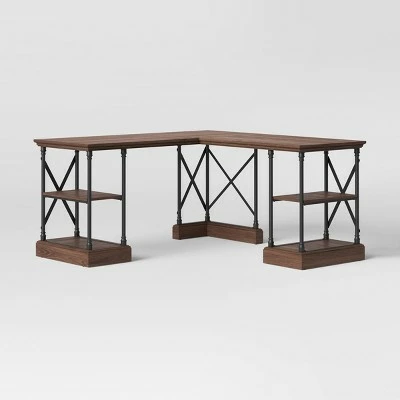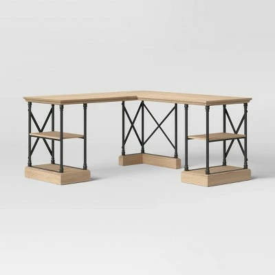 Make a functional addition to your workspace with this L Shaped Conway Desk from Threshold™. Designed in a convenient L shape that gives you plenty of surface for workspace, this mixed material desk has a wooden top supported by a metal frame with criss-cross accents for stylish, industrial-inspired look. The natural-finish brown tabletop pairs elegantly with the black metal frame for a contrasting look that will complement a wide variety of color palettes and office furnishings. And with the built-in open shelves, you’ll have plenty of convenient space to organize your office supplies, files and more.