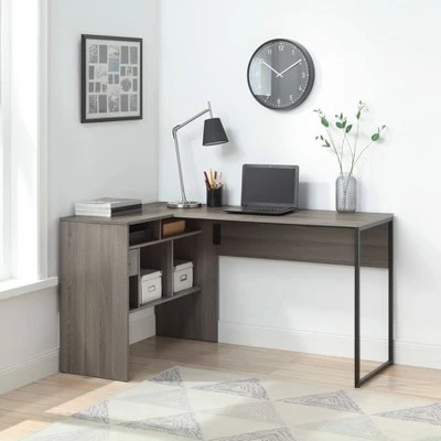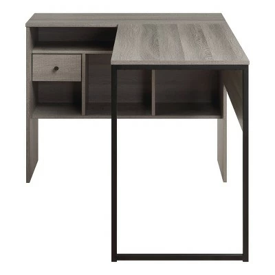 The Hagney Lane expansive L-shaped design and modern style make this an ideal anchor for your home office. The Farm Oak finish and sturdy metal frame is durable and stylish. The accessory drawer and under desk storage keep bins, books and office supplies organized and accessible.