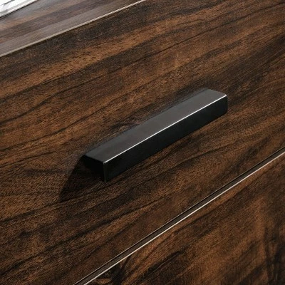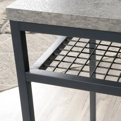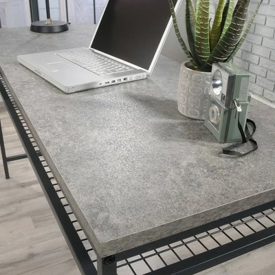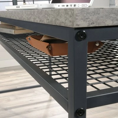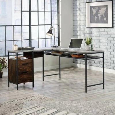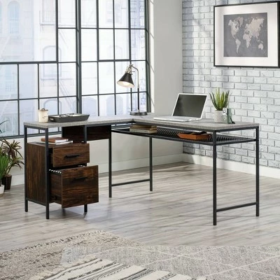 Find the motivation you need to tackle your big projects with the charming good looks and functional design of this L-shaped desk from the Market Commons® collection. This home office desk offers a spacious top surface that provides room for office essentials like your laptop, notepads, folders, and hot cup of coffee. The home office desk also offers plenty of room for items like an accent lamp and knick-knacks. The top features a strong and lightweight 1″ panel construction. This L-shaped desk with drawers features smooth metal runners to easily open and close storage drawers. The large lower drawer with full extension slides organizes letter-size hanging files and the two open shelves provide additional storage. Its durable, powder-coated metal frame and wire mesh back make this small office desk stand out. Finished on all sides in Rich Walnutâ„¢ with Slate Grayâ„¢ accents, this metal and wood desk will have you feeling ready to work.