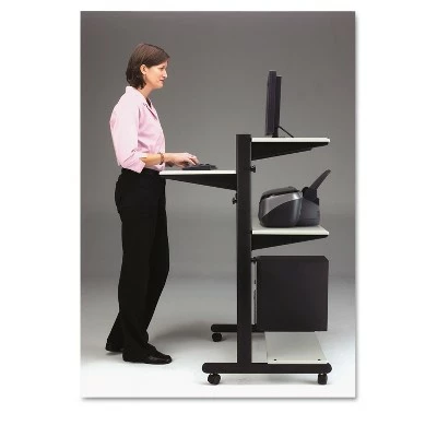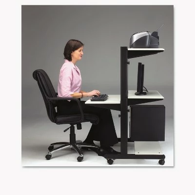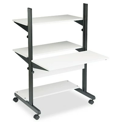 Safco Adjustable mobile computer table in gray/black color accommodates monitor, keyboard, printer, CPU as well as peripherals in 7 sq.ft. Safco Mobile computer table in gray/black color measures 50″ x 32″ x 31″ and has 1 fixed bottom and 3 adjustable shelves to place items. Table features knob to adjust shelves from 14″ – 48″ high for convenience. Perfect computer table for Small Offices or Home Offices. Holds monitor, keyboard, printer, CPU and peripherals in seven square feet. 50″H x 32″W x 31″D. Three 32w x 15d shelves support up to 100 lbs. each—holds monitor up to 21″. Four shelves – 1 fixed Bottom, 3 adjustable to a height of 14″ to 48″. Four casters, 2 locking. Shelf Width: 31″W x 32″D. Shelf Depth: 12″W x 15″D. Ready to assemble. Sold as 1 Each.