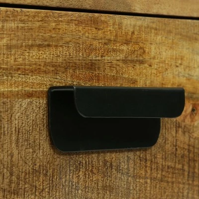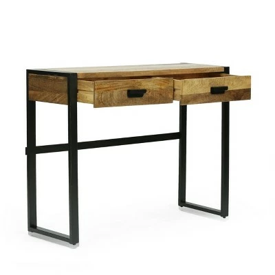 Tidy up your work space with a flourish, making your work a little easier and a little more stylish. Created for both functionality and impeccable style, our refined writing desk will not only provide a compact work area but will also open up your interior space with its precise design. With a rich mango wood top, simple sled legs, and two drawers for storage, this handcrafted writing desk offers a raw modern industrial atmosphere that will transform any room into one worthy of the most sophisticated.