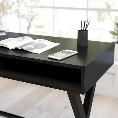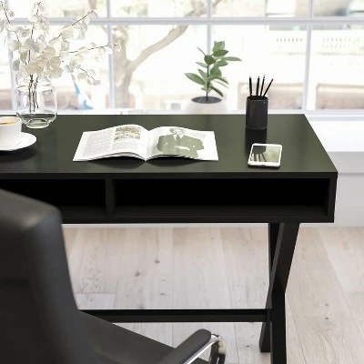 Take care of household budgets or make a dedicated study area with the understated sophistication of this black writing computer desk with 2 cubby storage areas. The blend of a minimalist design with easy function gives this home office desk a cultivated look that blends in multiple design schemes. This versatile solid rubberwood desk offers plenty of room for self-expression but works well in small spaces. A writing desk has a timeless appeal that will outlast passing design trends. Additional Features: Cleans Quickly with a Water Based Cleaner, Assembles Easily in 30 Minutes or Less, Item Size: 42.125″W x 20″D x 29.5″H