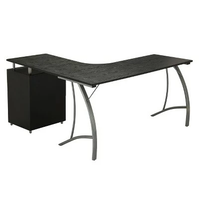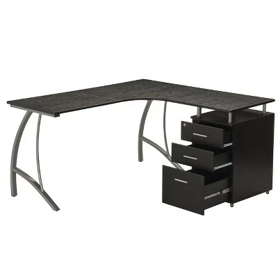 This modern Techni Mobili L-Shaped Computer Desk features a spacious desktop in a curved boomerang shape with a built-in locking storage cabinet and a hanging file cabinet. Curved legs are made of scratch-resistant powder-coated steel, while desktop and storage cabinet are made of heavy-duty engineered wood panels with PVC laminate surface. Color: Espresso