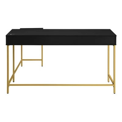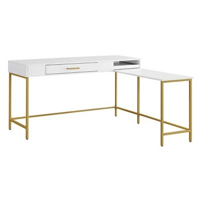 Contemporary from every angle, the spacious 54″ x 54″ Modern Life L Desk in matte finish adds sophistication to any space. Featuring trendy hardware and frame in a durable powder-coated gold finish. This desk will give the ‘wow’ factor to any home office. A smart accessories drawer with Euro, smooth-glide drawer slides keep everything organized and out of sight. Innovative power tray provides easy access to built-in power and charging port. The sophisticated design provides a perfect place to set up your laptop, enjoy a little extra storage for office supplies, and update your home décor.