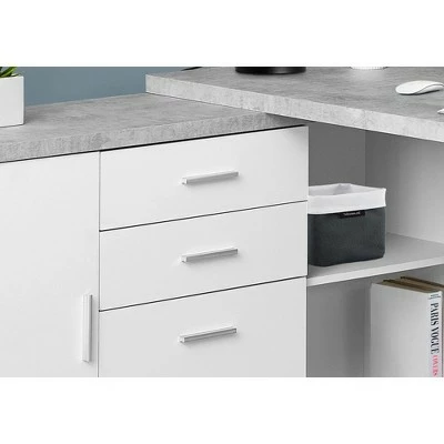 With plenty of space, this thick top workstation serves as your home office desk, computer desk or writing center effortlessly, allowing you to switch back and forth from your laptop to your notes or documents. Made for storage, the L shaped desk also offers 3 closed drawers, 2 adjustable shelves and a closed cabinet, all in a sleek white finish. For versatility, the desk can be configured left or right facing so that it can fit in any office of your small home, apartment or condo. In exceptional modern form, this desk is finished in a trendy cement look on all sides and simply keeps everything organized. When you’re ready to take your studies to the next level, this corner desk is there for you along the way. UPC Codes: 680796000936