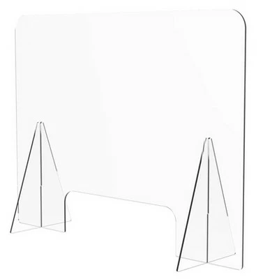 This free standing clear desk protective shield provides a barrier against sneezes, coughs, and respiratory droplets to protect users without isolating them from others. It is easy to assemble and can be setup in less than a minute. It is made of quality clear acrylic, with rounded top edges for safety and a clean, professional look. The bottom window cutout provides an easy way to facilitate transactions.