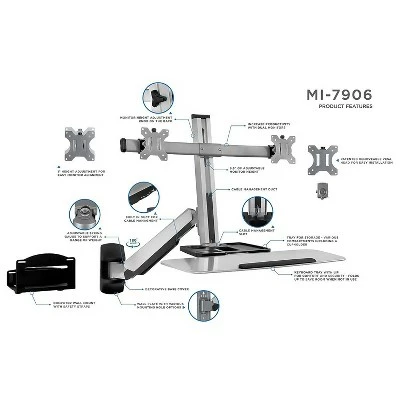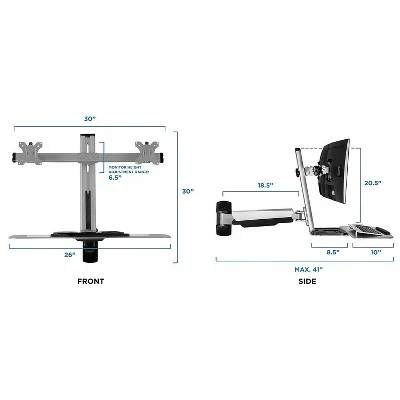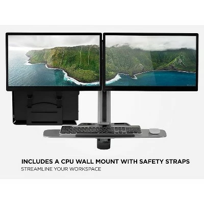 Mount-It! Sit Stand Wall Mount Workstation & Stand Up Computer Station With Dual Monitor Mount Articulating Keyboard Tray Arm and CPU Holder Change from sitting to standing in seconds with the full motion, wall-mounted workstation. The heavy-duty spring arm uses counter-balance technology. This allows you to only need to set it once to the optimal tension, and then you will be able to effortlessly move your sit-stand up to 19.9 inches for the desired height. The dual screen VESA bracket works with monitors up to 27 inches and can be tilted for the optimal viewing angle. The wide keyboard is 26.2 inches (length) by 10.2 inches (depth) and it conveniently folds away when you don’t need it. The workstation also features an organizer tray, built-in cable management ducts, and a bonus wall-mountable, CPU holder for a complete standing computer station. This wall mounted standing computer workstation is full motion and is easily height adjustable up to 19.9″ for a healthy posture will sitting or standing. The dual monitor bracket fits monitors up to 27″ with standard VESA patterns 75×75 and 100×100, and each VESA head supports 13.2 lbs per monitor. The wide keyboard tray is 26.2″ L x 10.2″ D and folds away to save space, and the bonus CPU holder wall mount has built-in safety straps for a secure fit. The monitor bracket tilts +/- 15 degrees and rotates +/- 180 degrees, while the spring arm swivels +/-90 degrees and is height adjustable by 19.9″. This standing computer station comes with a universal mounting kit that allows you to anchor it directly to wooden studs or concrete wall for stability. Sold as 1 Each.