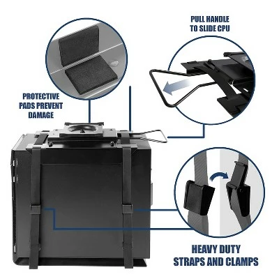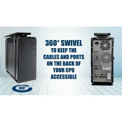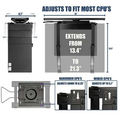 Place your CPU in a convenient and accessible location with the Mount-It! Adjustable Computer Tower Mount. The 360-degree swivel and 12.9 inches of sliding capability ensures easy access to cables and ports on the back of your CPU. Keep your computer safe by raising it off of the floor, saving it from dirt and dust. Save floor and desk top space, while keeping your computer within reach with this CPU Computer Tower Holder. Constructed with rustproof powder-coated steel for a sturdy build made to last. Heavy-Duty nylon straps and clamps are sure to keep your CPU tower safely in place. Keep your computer safe by raising it off of the floor, saving it from dirt and dust. Heavy-Duty nylon straps and clamps. Height Limit: 13.4 to 21.3 inches. Width Limit : 6.3 to 8.7 Inches. Weight Limit: 22 lbs. Sold as 1 Each.