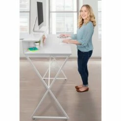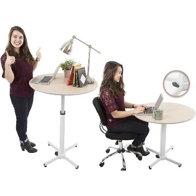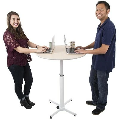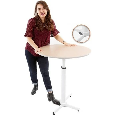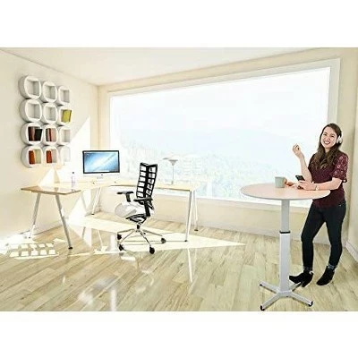 This Multifunctional Round Table by Stand Steady is a charming addition to any environment. With smooth air-cylinder, durable white base, and leveling feet, this table remains steady while you work. The laminate overlay creates an easy clean surface that is both scratch and spill resistant made to withstand daily use. Want to know more? The desktop has a diameter of 31.5” that can stand anywhere between 28” and 42.5” high. The base has four sturdy legs that are 10” long each making the total footprint 17.5” deep and 18.5” wide. The total weight of the table is 27 lbs. and can support up to 100 lbs.