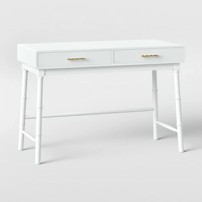 Bring a touch of unique and bold style to any room in your home with this Oslari Painted Desk from Opalhouse™. This desk is made with a sturdy wood frame and features a rounded rectangular top that has two pull-out drawers with gold metal pulls that are textured like bamboo. It also has four wooden legs with carved detailing that create an open and airy design. You can place this desk with two drawers in a home office or craft room to create a functional and stylish workspace. This is your house. Where you create spaces as bold as your spirit. Collect objects as inspired as your dreams. Find pieces that remind you of every place you’ve been. Discover stories to inspire everywhere you have yet to go. This is Opalhouse™.