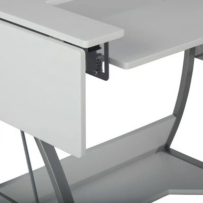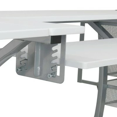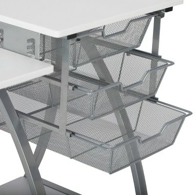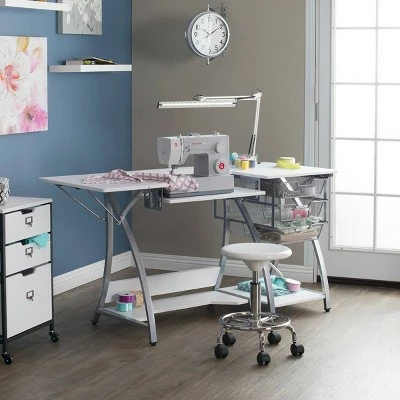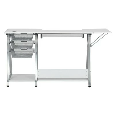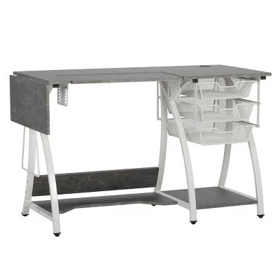 The Pro Stitch Sewing Machine Table with Storage is part of the Sew Ready Collection and features a 56.75-inch wide tabletop that allows you to cut or arrange fabric and patterns. The 9.5-inch wide drop leaf top folds, if less space is needed, when not in use. Our upgraded metal mesh drawers are durable and allow you to see your tools and supplies inside them. A lower shelf below the tabletop and below the drawers can accommodate your larger items. Our sewing machine platform allows you to select the perfect height for your sewing machine base to be flush with the table top. This will keep your fabric flowing seamlessly while sewing. This platform can be adjusted to the top position to be flush with the top. The heavy gauge steel construction and thick top make it a durable table for years of use. A 2-inch wide cord management hole keeps your cables organized. If your craft/sewing room is also your office, this table can also be used as a computer desk.