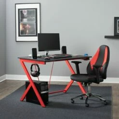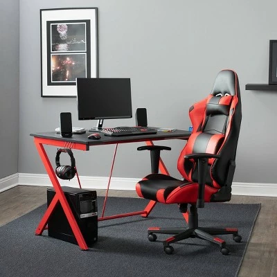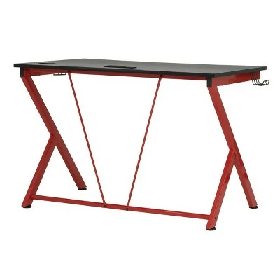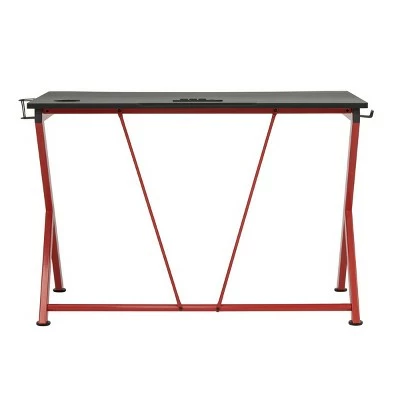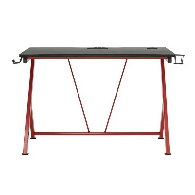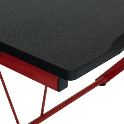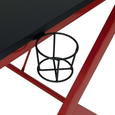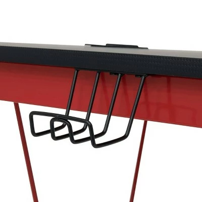 The Quest PC Gamer Computer Desk with Charging Station, Cup and Headphone Holder by SD Gaming features a large 4525” w x 29” deep gaming surface with a simulated carbon fiber finish and a beveled front cut out that keeps you closer to the monitor without sacrificing room for your accessories. It also provides gamer specific features: a cup holder and headphone hook that save desktop space. This gaming table has a power console that provides 3- grounded outlet receptors and 2-USB charging ports to keep your accessories powered. The desktop also has a cord management hole for organizing your electrical cords. The steel frame has a powder-coated finish that resist scratches and corrosion. The floor levelers and crossbars provide stability.