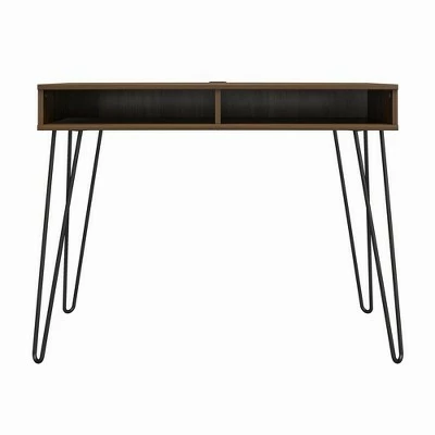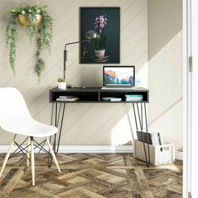 Add some mid-century style to your space with the Ameriwood Home Owen Computer Desk with Storage. This Desk features a modern black finish on the laminated particleboard that pairs with the black powder-coated metal hairpin legs for an elegant, retro style. The minimalistic design makes this Desk a perfect addition to your dorm room or small apartment. The desktop is large enough for you to finish homework or browse social media on your laptop. The 2 open cubbies allows you to store notebooks, writing utensils, and papers off of the desktop but still within reach to keep your workspace clutter free. The back of the desk features a long open cubby that is perfect for hiding a power strip. A wire grommet keeps your cords organized and tangle free. The top of the Desk comes preassembled to make assembly quick and easy by simply attaching the 4 legs. The Desk ships flat to your door and minimal assembly is required. Once assembled, the Desk measures to be 30.4”H x 40.5”W x 21.65”D.
