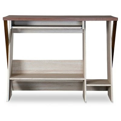 Many think “practical” means “boring.” Well, think again. Sure, our Rhombus Writing Desk offers utilitarian space for a computer, monitor and keyboard, but its angular, rhomboid design packs plenty of pizzazz to liven up any home office or study. Contrasting, two-toned Sonoma-oak finishing heightens the stylistic stance. Central Shelf Dimensions: 17.75 inches high x 26.5 inches wide x 11 inches deep