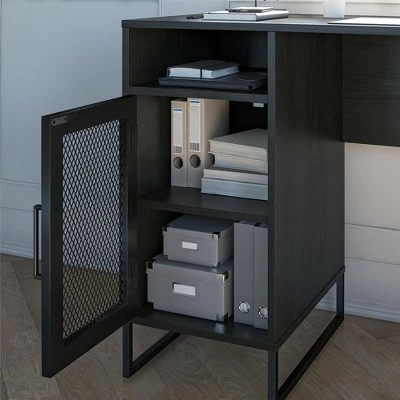 Work from home or head back to college in style with the Room & Joy Pacer Single Pedestal Computer Desk. Made of durable laminated MDF, particle board and sturdy powder coated metal, this piece gives your dorm room or home office the modern upgrade you crave, at an affordable cost you can stomach. The spacious desktop is perfect for your laptop or monitors, and the pedestal boasts of one fixed and one adjustable shelf to store reams or paper, books, documents, and other office essentials out of the way, but still within arms reach. The cubby above the cabinet provides even more storage for pens, pads of paper, and post it notes, so you’re always ready for the task at hand. Pair with the matching Pacer Storage cabinet (sold separately) for even more space for your printer and other office materials. The metal mesh cabinet door is carefully crafted with a magnetic catch for a smooth and secure close every time. Once assembled the desk measures to be 47.64” W x 19.68” D x 30” H and weighs 58.51 lbs. The desk ships flat to your door in one box. Two adults recommended to assemble.