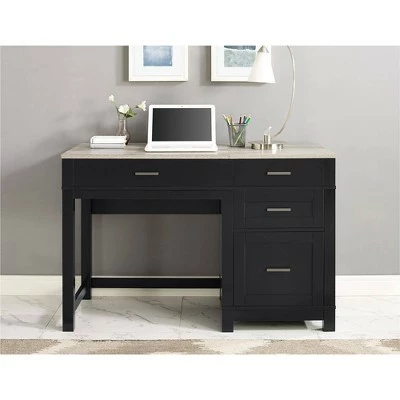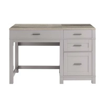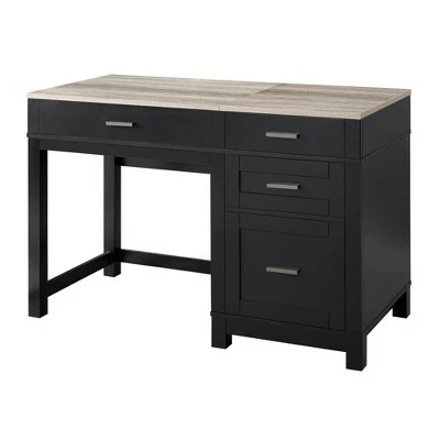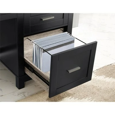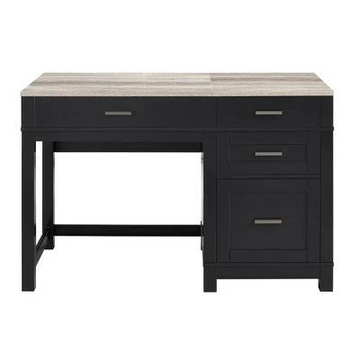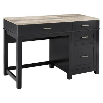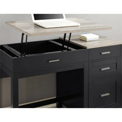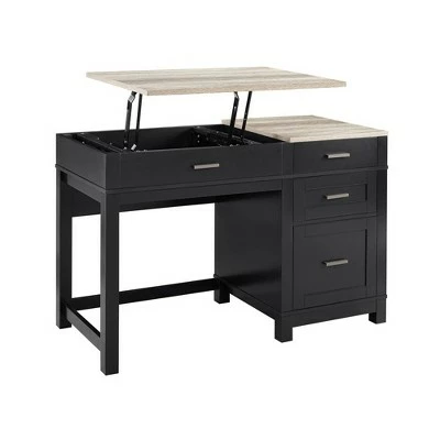 Your home office doesn’t have to be stale. Spruce it up with the Room & Joy Paramount Lift Top Desk to bring in a new level of sophisticated, functional style. This desk is designed with plenty of leg room with an added bonus of 3 storage drawers down the right side. The bottom drawer conveniently hangs letter sized files to keep your office organized. If you are the type of person that likes to move around during the workday, this lift top will be a life saver! Simply pull the large left portion of the desk upward to the perfect standing height so you can work in the most comfortable position for you. The metal mechanism provides a smooth transition from sitting to standing. Under the lift top is additional storage for small items and a decorative handle to look like an extra drawer. This Paramount desk is finished in a two-tone black and distressed brown oak finish with a mixture of laminated particleboard, MDF and paint to complete the look. Measuring in at 30.7″H x 47.2″W x 21.2″D, this desk is recommended to be assembled by 2 adults for the best results.