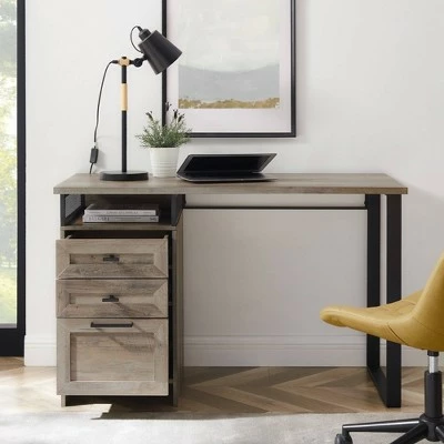 Jot down your next stroke of inspiration while sitting at Saracina Home’s Salem Urban Industrial 3 Drawer Writing Desk. One open cubby with metal mesh sides and three drawers on telescoping metal glides give you the open and closed storage you need to organize your office supplies. The wood construction and bold metal details showcases your contemporary style in your designated workspace. Feed any rogue cables through the cord management slot at the back of the desk to keep your home office looking tidy. Whether you’re sitting at the computer for work, gaming, or tackling your next craft, the Salem stands up to the task.