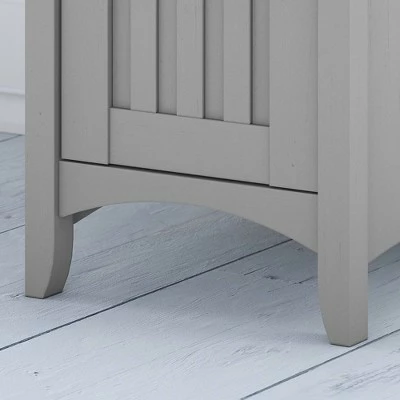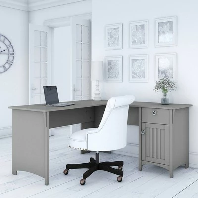 Make your home office space comfortable, functional and beautiful with the Bush Furniture Salinas L Shaped Desk with Storage. Attractive wood details, vertical accents, curved base rails and tapered legs inspired by Mission style create a casual look fit for a cottage, family home or apartment. You’ll love all the room you have to multitask on the L Shaped Desk surface, designed to save space in your home with a variety of placement options, including in the corner. Surf the net, pay bills, read a good book or the morning paper, and enjoy all the legroom you need with the open design. Store writing utensils and small office supplies in the convenient box drawer and keep larger items in a storage cabinet that features an adjustable shelf. The corner desk with storage is tested to meet ANSI/SOHO quality standards for safety and performance and is backed by a 1 year manufacturer’s warranty.