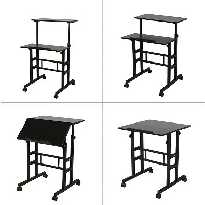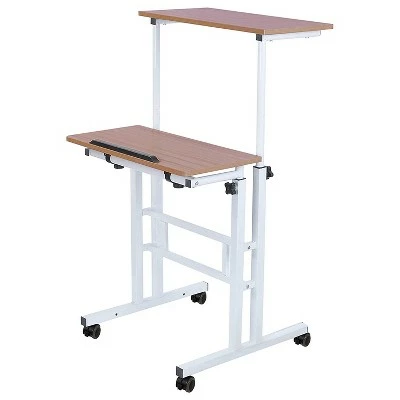 Enjoy the freedom to stand, sit, stretch, and stay comfortable as you power through your To-Do list with the SDADI Adjustable Height Mobile Standing Office Computer Desk.This standing computer desk features 2 tiers and an adjustable height design that lets you customize your work area as your needs change throughout the day. Supported by a tubed steel frame, the work surfaces are made from lightweight MDF. A sleek white and dark brown finish helps the desk fit into any modern workspace. The lower surface is also angle-adjustable up to 90 degrees, letting you use it as support for your notebook or a keyboard tray. You can also adjust the office monitor desk so that both surfaces are level for an expanded working area. Lockable caster wheels make moving the desk around your office or from room-to-room a snap.Customize your home or professional office for comfort with the SDADI Adjustable Height Mobile Standing Office Computer Desk.
