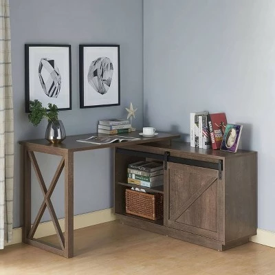 Give your home office character with this rustic farmhouse style desk. It comes with a sliding farmhouse style plank door that features two shelves behind it and an eye-catching X-cross leg design for added style. The corner desk is also finished on the backside, so you can position it to face the center of the room as well.