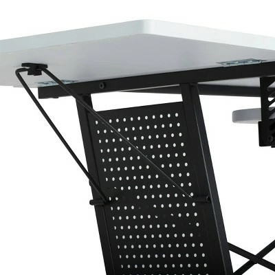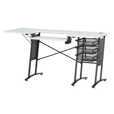 The Sew Master Sewing Machine Table with Drawers is part of our Sew Ready Collection and is ideal for your sewing or craft projects. You can create a large 60.5-inch wide table top when you expand the 13-inch drop leaf and position the sewing machine platform to its top position. The three metal mesh drawers keep your supplies close and visible while you work. The sewing machine platform can be positioned so your sewing machine’s base is level with the top, so fabric glides easily while sewing. If your craft room is also your office, this table can also be used as a computer desk. The metal frame and laminated top are durable for years of use. A 2-inch wide cord management hole keeps your cables organized. Floor levelers keep this table stable on uneven flooring.