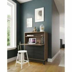 - Nicely hides away your laptop, tablet, cables and accessories once the drop-down door is closed