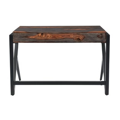 From the black powder coated metal frame to the gently slanted front from which two spacious drawers emerge, we’ve hit all the right angles with this handsome Writing Desk! Richly grained and exotic Sheesham wood has been finished is our Sierra Brown to create a surface that just gleams, inviting you to sit, and giving you a desk for your home office, den or study that is as beautiful to look at as it is functional to work at.