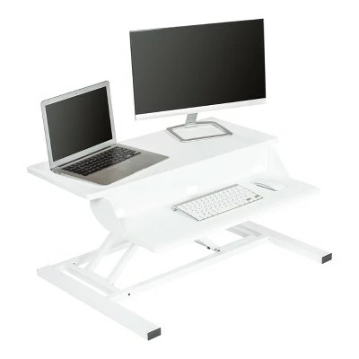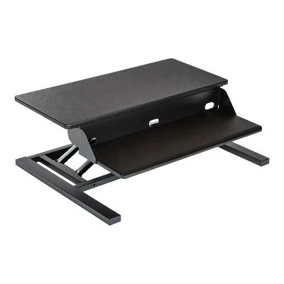 The Stand Up Desk Store AirRise Pro Adjustable Height Standing Desk Converter converts any flat surface into an ergonomic sit-stand workstation. It offers all the features of our other popular desktop converters, and adds an ergonomic two-level design. This places your monitors, keyboard, and mouse at ergonomic, comfortable heights to help ensure hours of pain and fatigue-free use. Setup couldn’t be easier, simply place our adjustable converter on top of your current desk and easily transition between a seated and standing position. The AirRise is made with a sturdy and stable powder-coated steel frame. It features a lever-actuated pneumatic lift that effortlessly raises and lowers your converter, so you can transition from sitting to standing in seconds. Chamfered edges allow for comfortable, pain-free typing, while a textured, non-skid top keeps your computer equipment securely in place. Built-in cable management helps keep cords tidy. Overall dimensions are 32″ W x 23.5″ D x 5.75” to 15.75″ H. Lift assist optimized for 15 lbs. Maximum weight capacity is 35 lbs. Powder-coated steel frame. BIFMA certified for safety and durability. No assembly required. 5-year limited warranty against defects. Stand Up Desk Store is based in the suburbs of Chicago.