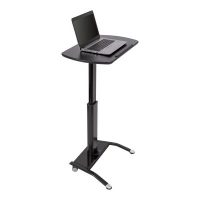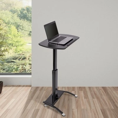 Stand Up Desk Store’s Pneumatic Adjustable Height Tilting Laptop Lectern Speakers Podium is a multifunctional item that’s equally great for presentations and for use as a laptop desk. The pneumatic height adjustment raises and lowers the desktop with an easy step of the pedal, while the presenter’s shelf can be set flat or to 20, 30, and 90-degree angles. Comes with a set of two furniture feet to provide a stable platform and two wheels to make it easy to move. Overall dimensions are 25.5″ W x 17″ D x 28″ to 42.5″ H. Weight capacity is 100 lbs. BIFMA certified for safety and durability. Easy assembly. 5-year limited warranty against defects. Stand Up Desk Store is based in the suburbs of Chicago.