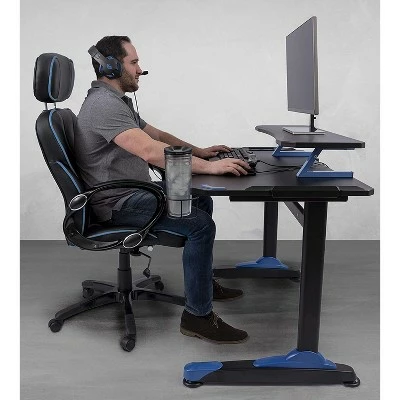 If your gaming area needs something more inspiring than a typical office PC desk, the Stand Up Desk Store 48″ Two Tier Gaming Desk is for you. Highlights include a built-in cup holder, headphone hook, and cable management system. The integrated monitor stand raises two screens – up to 27 inches each – 5.5 inches above the desktop for comfortable viewing with less neck strain. The front edge of the gaming computer desk is contoured for more comfortable operation of your gaming mouse and keyboard. The top features a modern, carbon fiber look, while colored accents pop on both the top and the frame. Add in Stand Up Desk Store’s customer service and you get the best gaming desk there is when it comes to features and value. Overall dimensions are 47.13″ W x 25.5″ D x 30″ H;. Frame made of powder-coated steel. 5-year limited warranty against defects. Stand Up Desk Store is based in the suburbs of Chicago.