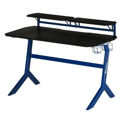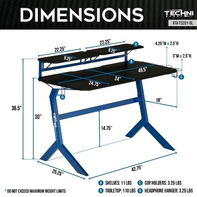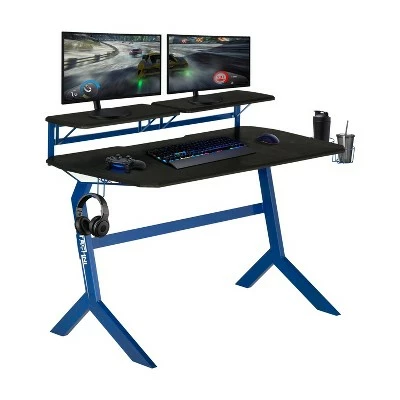 Gaming with our Blue Stryker Gaming Desk, we can assure to provide you with the best gaming/working experience. It offers an ergonomic and sleek design. The desk surface is made with MDF panel, carbon fiber like texture, heavy duty and powder coated/scratch and rust resistant steel frame. It comes equipped with built in headphone holder and two cup holders, easy to install at any other side of the desk as per choice. The elevated and removable stable dual shelves which fits two monitors which enhances your gaming/working experience to the next level. This desk top supports the up to 110 lbs, it comes with 5 years limited warranty.
