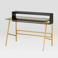 Embody the minimalist lifestyle with this Mid-century inspired writing desk. A simple yet spacious desk that will help with keeping your home-office organized, coupled with an open dual storage shelf system. The Laminated wood finish adds to its modern contemporary feel while also having a wide and sturdy frame. This desk is essential for small work places with its small foot print. The desk area is made of a smoke tempered-glass table top that is supported by gold color metal legs.