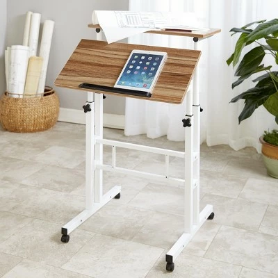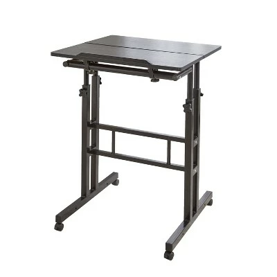 Enjoy the convenience of a mobile workspace with this tiered rolling podium. It moves easily from room to room to use for work, homework or even online shopping. The laminate tabletop offers plenty of space for writing and storing the items you need close by. The desktop can lay flat, or one tier can tilt to hold a tablet or notebook on the built-in rest. Adjust the height for sitting or standing by moving the desktop to the desired height and tightening the knob to secure it. Metal, MDF and polypropylene. Has 4 locking casters. Assembly required; assembly hardware included. 23-3/4″W x 23-3/4″D x 26-3/8″- 45″H.