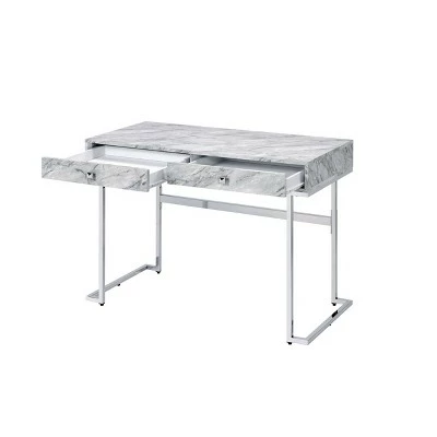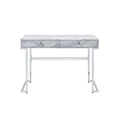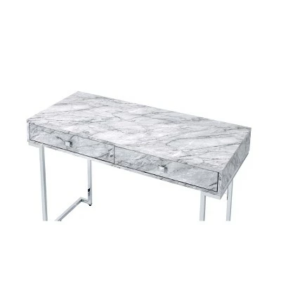 Be the envy of zoom meetings with the Tigress Writing Desk. The faux marble finish is a fresh take on traditional desks. The durable metal chrome finish base reflects light and draws attention to the piece making this the focal point. The simplistic design is suitable for apartments, homes, and offices.