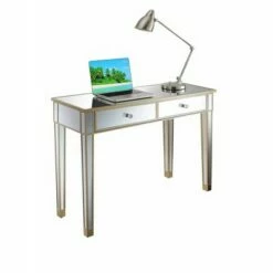 Work in style with the Town Square Chrome Desk with Shelf by Breighton Home. With its innovative design, it flaunts a contemporary style that will refresh your home office or den. Both the tabletop and shelf are crafted from tempered clear glass, making it a breeze to locate all your work supplies. The chromed metal frame with signature geometric side designs, makes this item sturdy enough for your laptop, a lamp, and your notebooks. Get excited to work once again and obtain this chic unit today! Set up is quick and easy, requiring only 4 steps. Complete the look with additional items from the Town Square Collection by Breighton Home. Each sold separately.