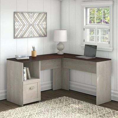 Create a stylish and functional personal workspace anywhere you need it with the Bush Furniture Townhill 54W L Shaped Desk. Place the desk in a corner to save floor space in your apartment, dorm or small home office, or make use of the finished privacy panels to take a prominent position in the middle of the room. Quality construction gives the desktop a weight capacity of 200 pounds to support all the work materials you need to stay productive. Keep important paperwork and supplies organized and accessible with the built-in file cabinet and open cubby space. The full-extension file drawer accepts letter-size documents while the storage shelf includes a wire management grommet that keeps cords and cables out of the way while charging a laptop and other electronic devices. An attractive two-tone Washed Gray and Madison Cherry finish with Brushed Nickel hardware gives the Townhill Collection a relaxed appearance that fits seamlessly with any transitional, cottage or modern farmhouse decor. Add to your workspace with coordinating Lateral File Cabinet or 2 Shelf Bookcase (sold separately). The Townhill 54W L Shaped Desk is tested to meet ANSI/SOHO quality standards for safety and performance and is backed by the Bush Furniture 1 Year Manufacturer’s Warranty.