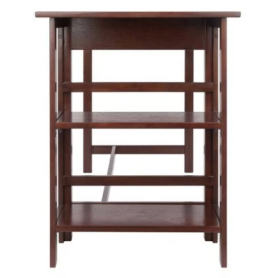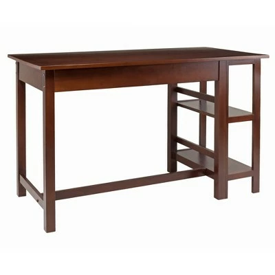 The Velda Writing Desk from Winsome is an ideal anchor for your work space. This walnut wood writing desk provides a large surface that’s perfect for multitasking, while the built-in shelves on the left side provide space to store or display books, folders and more. Plus, the single drawer is useful for holding paperwork, writing utensils or other small items. This desk can serve as a computer desk or writing desk in your home’s office, bedroom or den. The size provides for maximized workspace and the design creates a look that is both attractive and simple. Table work surface area is 50″W x 24.25″D. with one drawer to store your writing essentials and it has insider dimension of 25.12″W x 12.64″D x 2.13″H. Special feature of side shelves can accommodate blinders, folders or books. Top shelf surface is 20″W x 8.82″D x 12.52″H. Lower shelf is 20″W x 8.82″D x 11.65″H. Table is 30″ in height.