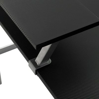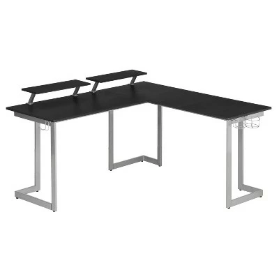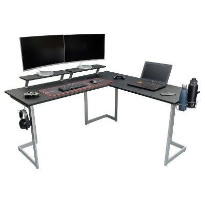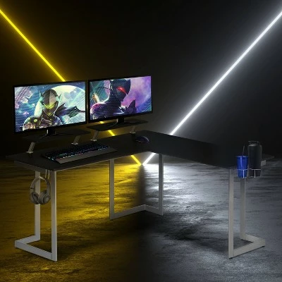 Elevate the productivity of your game with our Techni Sport Warrior L-shaped gaming desk. Maximize your floor space while being multitasking. It features two cup holders and headphone holder, easy to install either left or right side of the desk as per choice. The top surface and the two elevated and removable durable shelves are made with MDF panel, black carbon fiber like texture. Its frame is richly painted in matte silver color, made of heavy duty powder-coated steel structure. From gaming at your computer to managing daily work, this L-Shaped desk helps you get things done with ease. Weight limit: 130 lbs., comes with 5 year limited warranty.