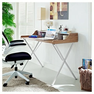 The problem with work desks is that while they do much, they often say little. Bin corrects the issue of desk apathy by helping you keep everything you need in plain sight. Whether you plan to use Bin to answer to your homework, pen diary entries, or embark on other creative pursuits with crafting supplies, you can say goodbye to clunky storage and filing drawers that rarely get used anyway. Bin is constructed with a wood-grained melamine top and a powder-coated white metal A-frame design. A pleasant addition to your contemporary or traditional décor, Bin also comes with four-foot pads to prevent scratching.