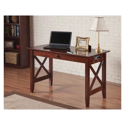 Ample study space and a drawer to store supplies are the hallmarks of our functional and fashionable Lexi Desk. The distinctive crossed design will make your office the focal point of your home. As durable as they are chic, this desk is manufactured using sustainably sourced solid hardwood. The perfect addition to any home office or study space, this desk offers a large work area that comfortably accommodates a laptop or desktop, along with a spacious storage drawer for all of your other work essentials. This desk also includes a built-in charging station for all of your favorite devices!
