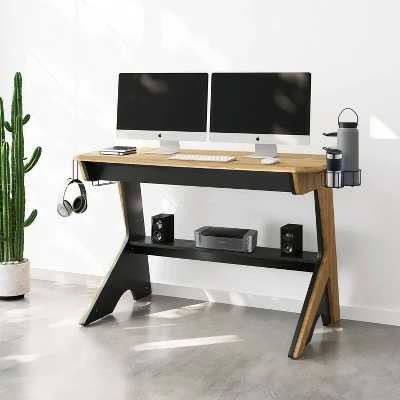 Effortlessly blending mid-century modern design aesthetics with rustic industrial elements, this charismatic Home Office Writing Desk lends curated appeal to your home office ensemble. Crafted from engineered wood, with a natural wooden look veneers, it can turn any area of your home into a sleek workspace. It has 2-tier accessory rack, accessory holder, standard size and large size cup holder and headphone holder that can be installed on either side while keeping accessories within reach. There is a bottom shelf that helps to keep the printer and speakers organized. This desk showcases a streamlined durable MDF frame with added two-tone sides with a classic touch. It offers plenty of space for your laptop, one or two monitors and favorite desktop knickknacks.