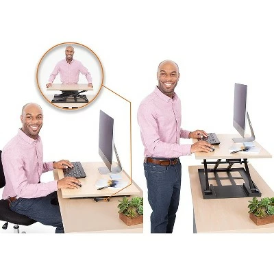 Living a more productive life really can be this simple. With no assembly required, just place your X-Elite Pro by Stand Steady on any desk or surface and use the pneumatic air-assisted lift to smoothly and quickly make any desk sit-to-stand. Want to know more? The X-Elite Pro weighs only 25 lbs. and can support up to 20lbs. Its desktop is 28” wide and 19” deep. It can be adjusted anywhere between 2.25” and 16.75” high. The best part? Its compact footprint is only 16.25” long and 23.5” wide while the desktop still provides ample room for all your desk necessities.